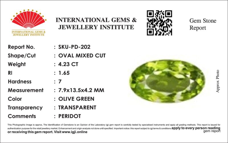 Peridot, a semi-precious gemstone, is said to have many benefits, including: Emotional and mental healing Peridot is believed to balance emotions and the mind, and can help with negative emotions like anger, depression, loneliness, regret, jealousy, and self-pity. It can also help with anxiety, nervousness, and fear. Spiritual growth Peridot is associated with the heart and solar plexus chakras, and is said to open and balance them. It’s also believed to bring about love and kindness, and enhance spiritual growth and connection with higher realms.. Peridot is highly appreciated for its very unique Color which is not seen in any other gemstone. Peridot is Birthstone of August month as per western astrology. Peridot is believed to bring Intelligence, Harmony and Prosperity to the wearer.